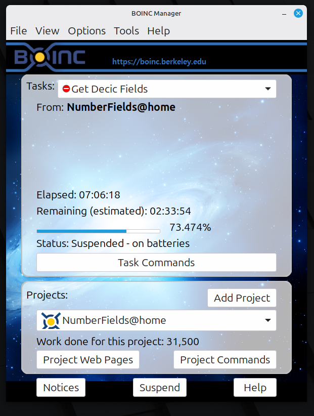 Since there wasn’t work available for any of my usual citizen science computing projects like Rosetta@home, Ramanujan Machine, and World Community Grid, I decided to try contributing elsewhere through BOINC. Letting my system sit idle felt like a waste, so I randomly picked up a work unit from NumberFields@home. It contributes to number theory research including: improvements to algorithms like integer factorization, discrete logarithms and primality testing.